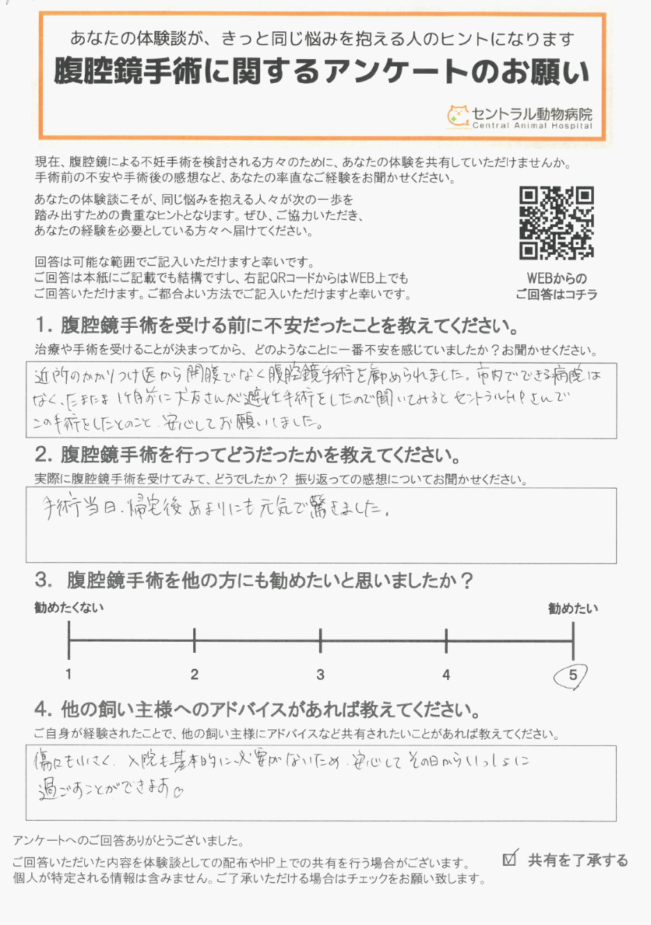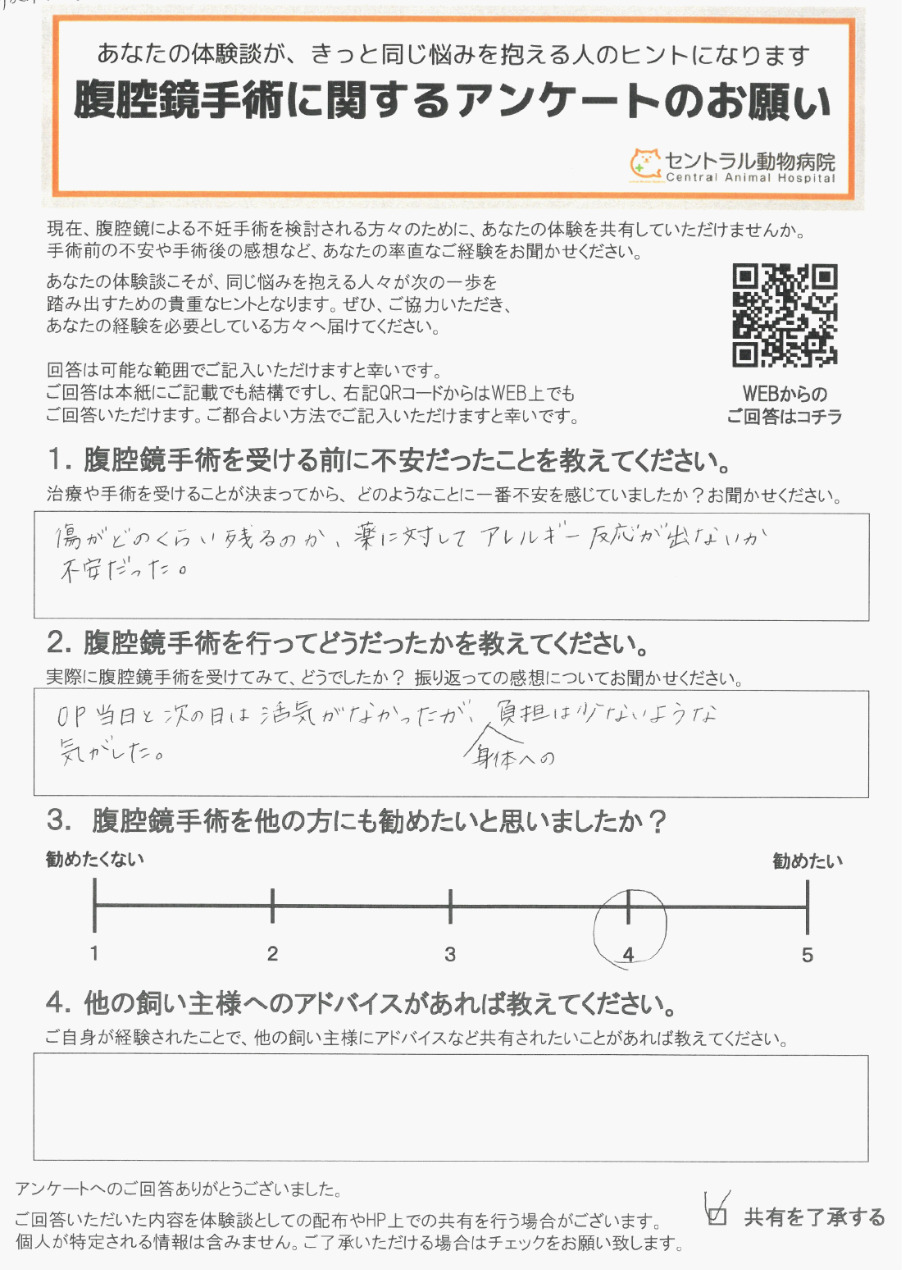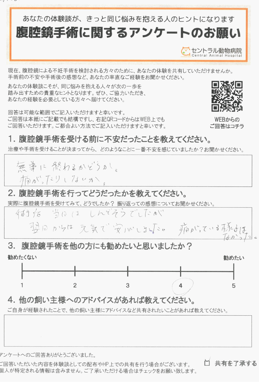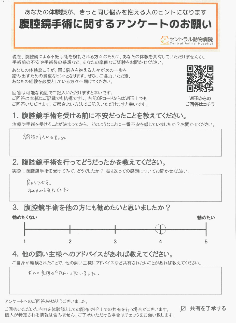 「他の飼い主様へのアドバイス」など、率直な感想を伺いました。腹腔鏡手術を検討されている方はご参考になさってください。