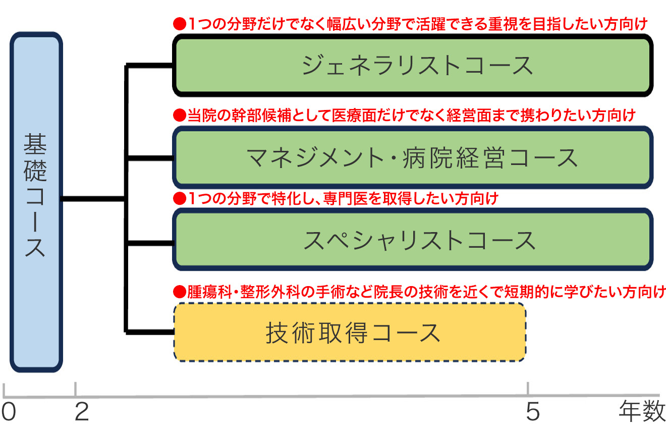 また、マネジメントや経営などに興味がある方に対しては、マネジメント領域や病院経営関連領域でも活躍できるようサポートします。【ジェネラリストコースの到達目標】